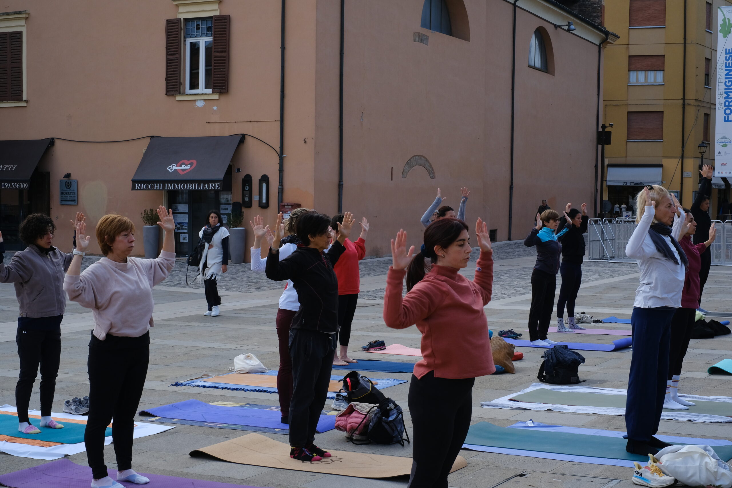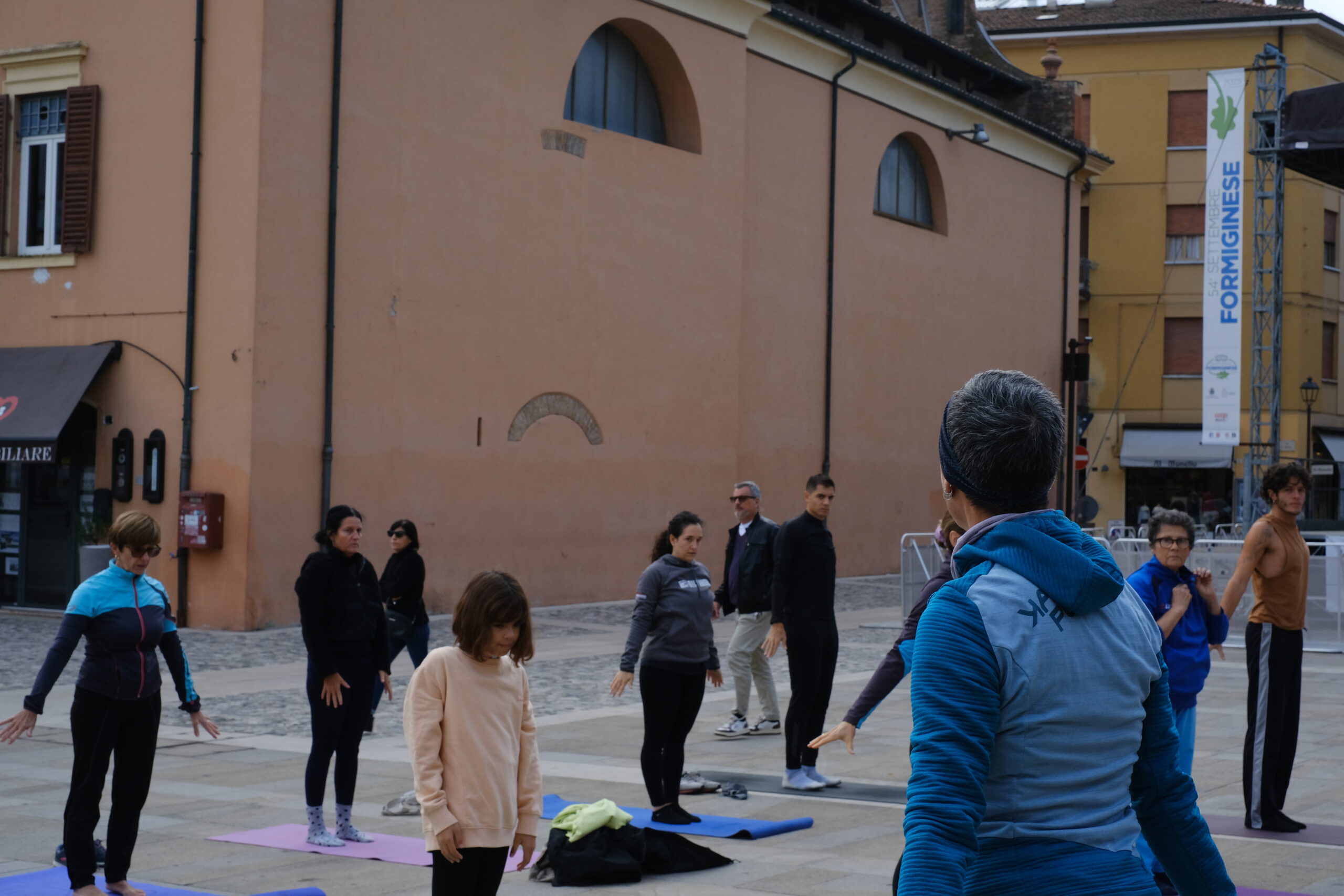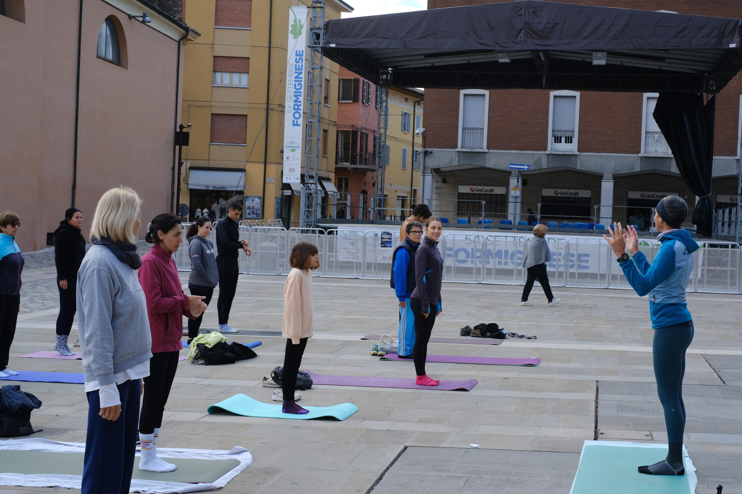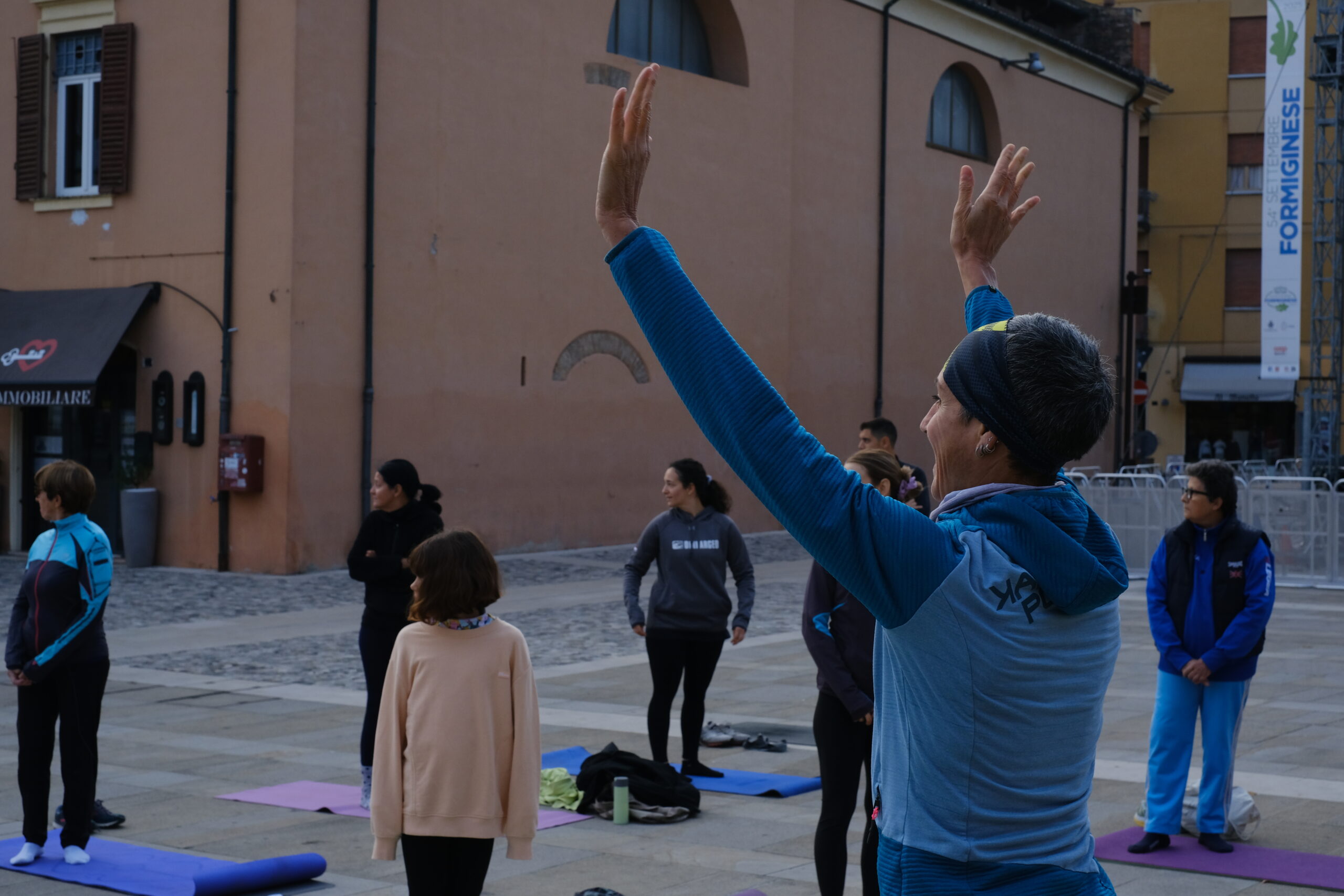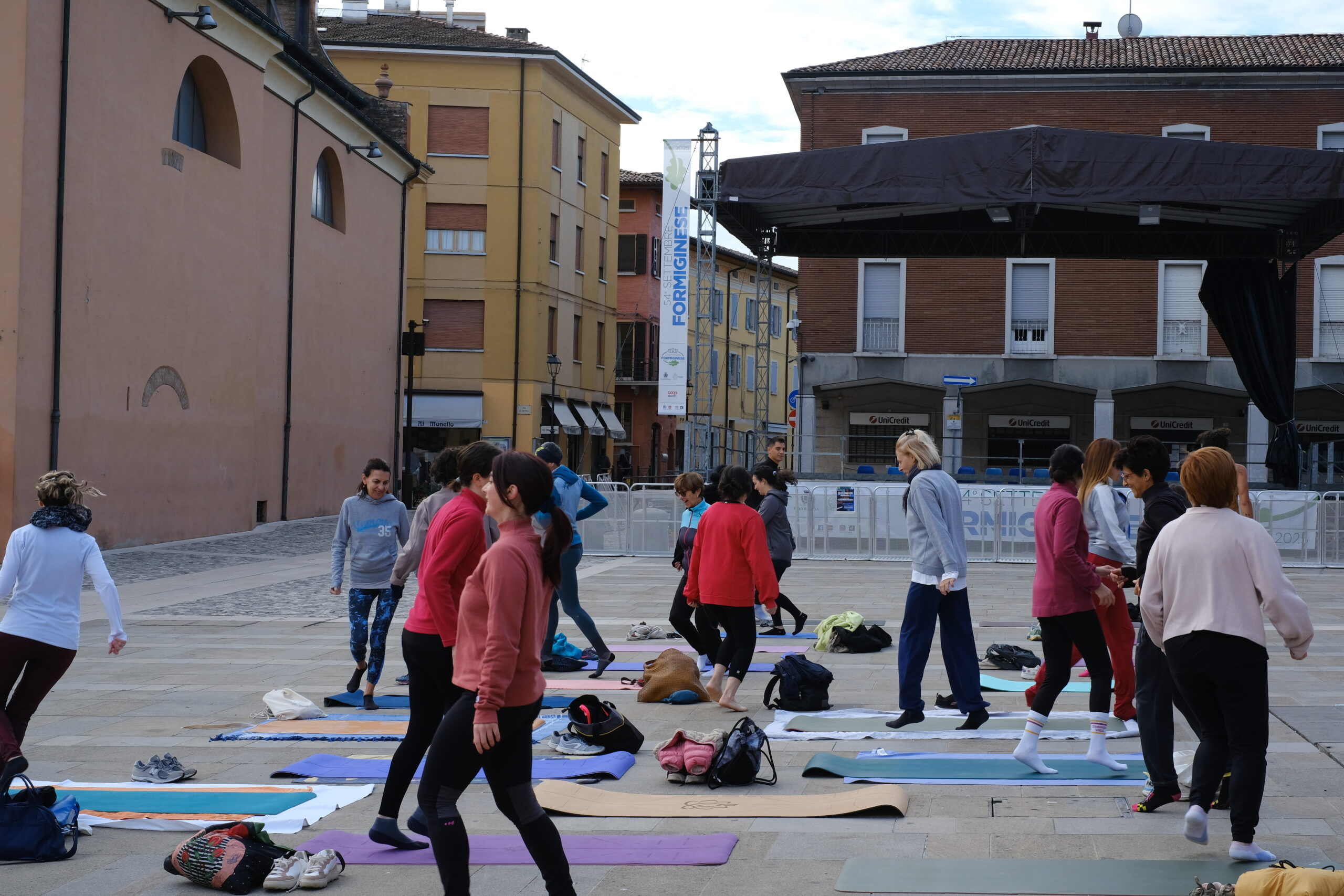 Da quando ho aperto il mio piccolo studio di yoga a Formigine, ogni giorno, con dedizione e gratitudine, cerco di creare una piccola comunità di persone che trovano un angolo di rifugio e benessere. Un luogo dove sentirsi accolti, in famiglia. E il sabato del Festival ne ho avuto la conferma: nonostante l’aria frizzante del mattino, una ventina di persone si sono presentate alle 9:00 per praticare yoga insieme a me, riempiendo la piazza di sorrisi e respiro condiviso.