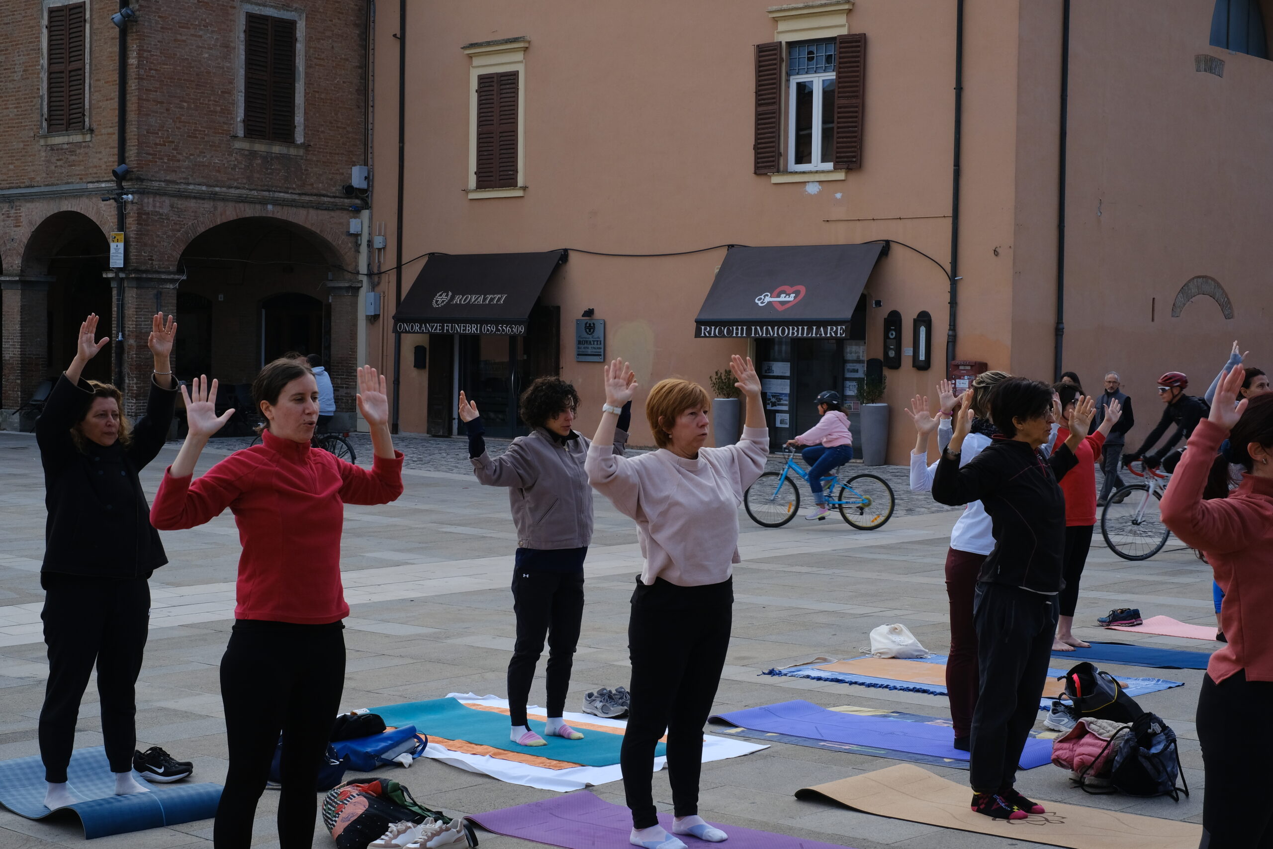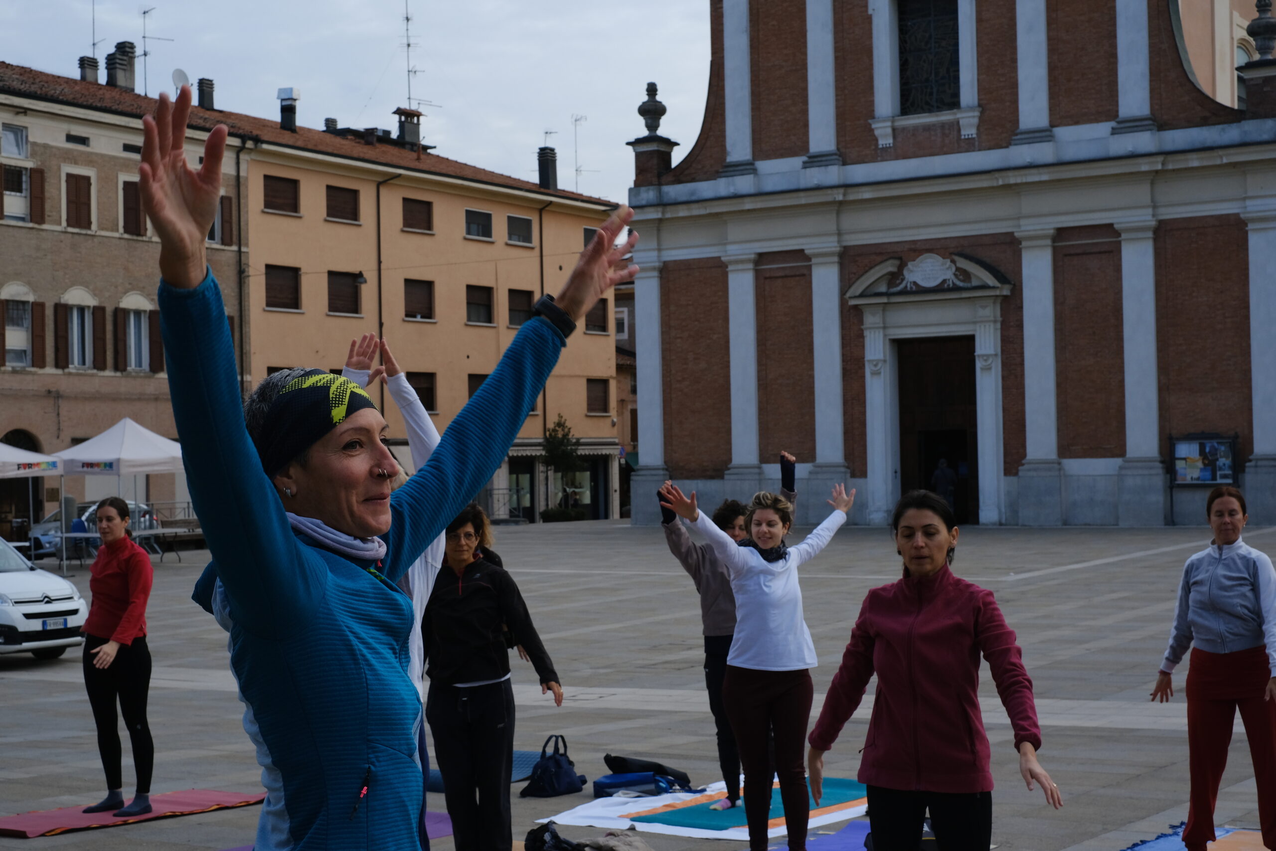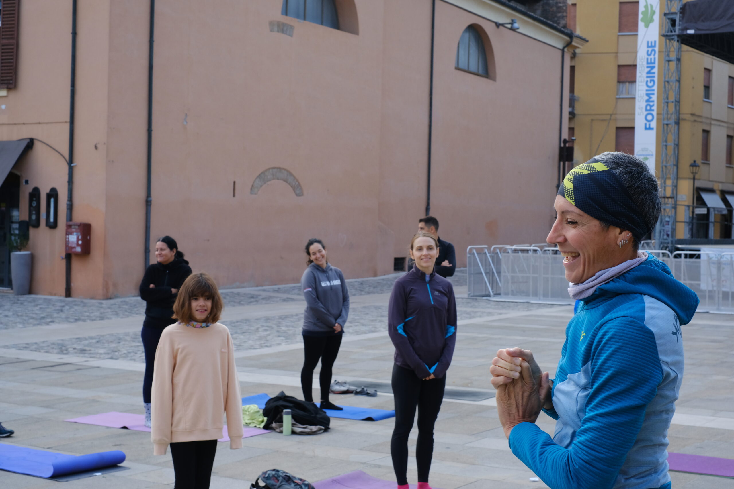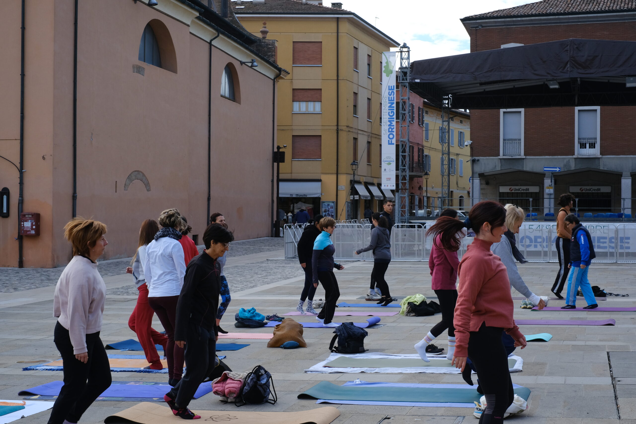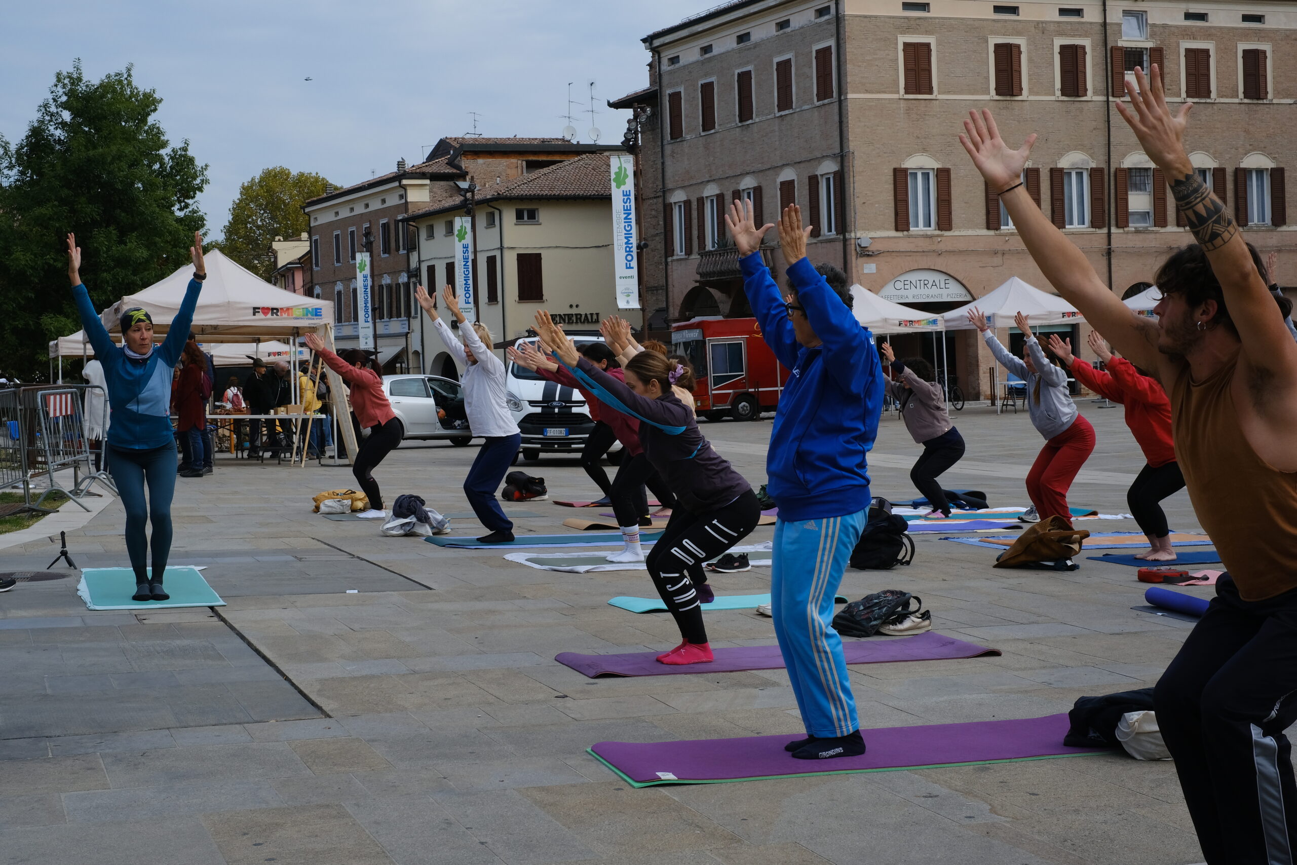 Da quando ho aperto il mio piccolo studio di yoga a Formigine, ogni giorno, con dedizione e gratitudine, cerco di creare una piccola comunità di persone che trovano un angolo di rifugio e benessere. Un luogo dove sentirsi accolti, in famiglia. E il sabato del Festival ne ho avuto la conferma: nonostante l’aria frizzante del mattino, una ventina di persone si sono presentate alle 9:00 per praticare yoga insieme a me, riempiendo la piazza di sorrisi e respiro condiviso.
